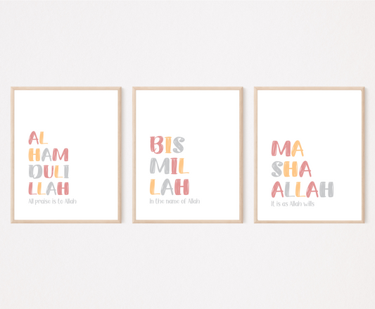Alhamdulillah, Bismillah, and Mashallah Prints Set of 3