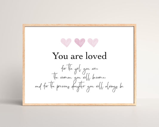 You Are Loved for the Girl You Are Horizontal Print - Pink Hearts